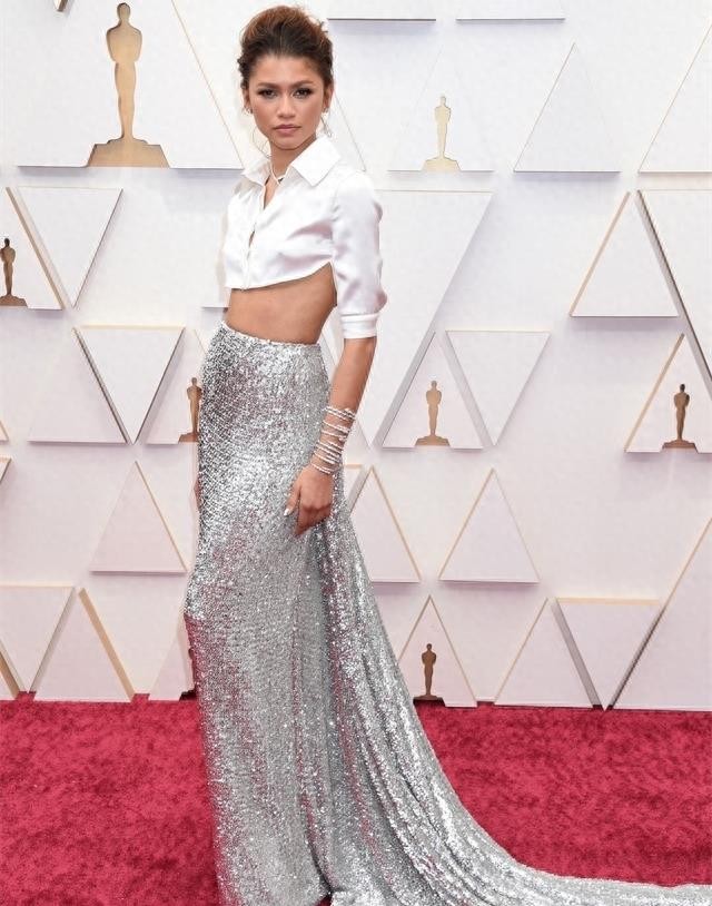 赞达亚在奥斯卡金像奖颁奖典礼上以银色拖地裙搭配白衬衫的华丽造型吸引了全场的目光。