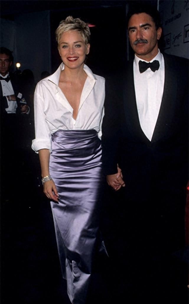莎朗-斯通在1998年奥斯卡颁奖典礼上敞开前襟的白衬衫与Vera Wong的短裙相得益彰,展现出她的优雅身材。
