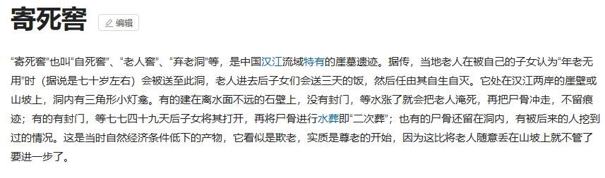 “寄死窑”又称“自死窑”、“老人洞”等,指的是在山壁上或灌木丛中挖掘可容一人大小的洞窟用来寄放失去劳动能力的老人。