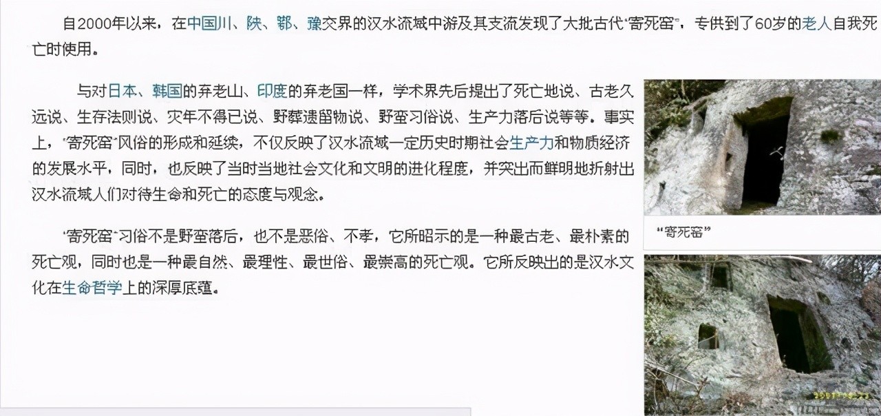 自2000年以来,在我国川、陕、鄂、豫交界的汉水流域中游及其支流就发现了大批古代“寄死窑”,例如现在在湖北省十堰市郧县江对岸的老化肥厂下面的码头边,你可以亲眼看到这些遗址。