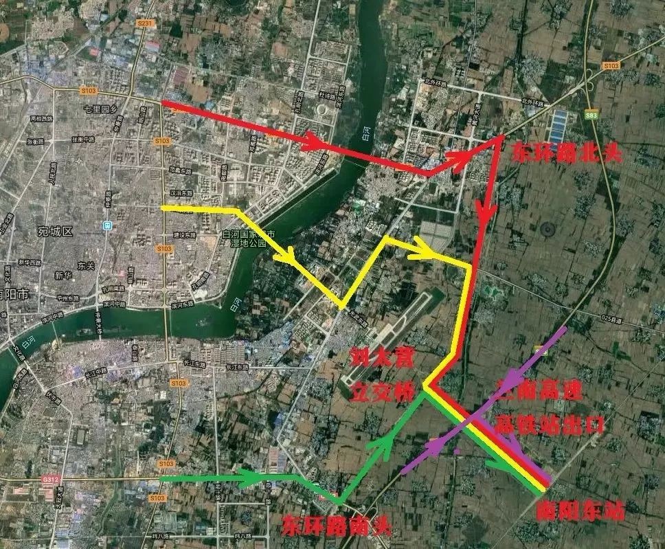 从信臣路向东经南阳大桥跨越白河,交迎宾大道后继续向东北方向行驶1.5公里至东环路北头,右转沿东环路向南行驶6公里至刘太营立交,交高铁站快速通道向东行驶约4公里到达高铁站。