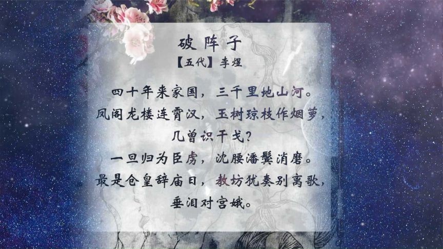 3、《破阵子·四十年来家国》:全词通过今昔对比,看似只是平平无奇的写实,却饱含了对故国的留恋与亡国的悔恨之意。全词如下: