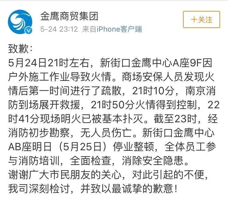 全部力量到场后,经全力扑救于22时40分扑灭现场明火。经初步调查,起火原因为金鹰中心A座9楼装修改造工地的施工人员在拆除油烟机设备过程中违规动火作业引燃可燃物,具体原因和损失在进一步调查和统计中。