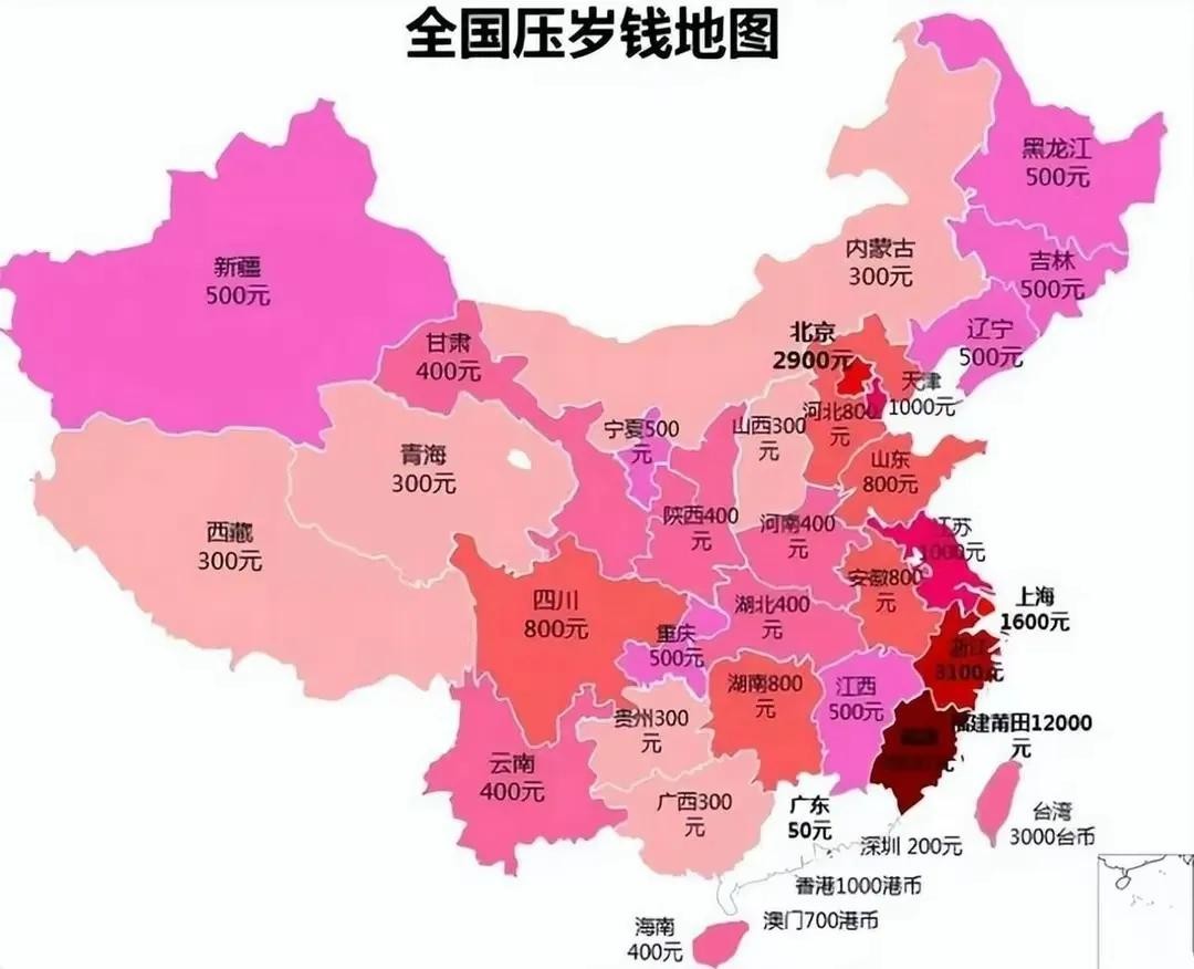 虽然说红包是美好的祝福,但现在随着经济的发展,红包的金额也逐步增多,有时候也会成为一种压力。可以看下某软件统计的“全国压岁钱分布图”,除了广东省以外,现在很多地方红包的金额都是500元,有的地方甚至更高。