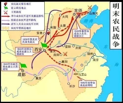 崇祯十七,也就是1644年年初,李自成在西安建立大顺政权,随即向北京进军。二月入山西,一路东进势如破竹,迫至北京城下。四月十八日,北京守城太监开门献城,十九日,崇祯帝朱由检自缢梅山,大明王朝的统治被农民起义推翻,同时张献忠部亦于当年八月攻占成都,建立了大西政权。