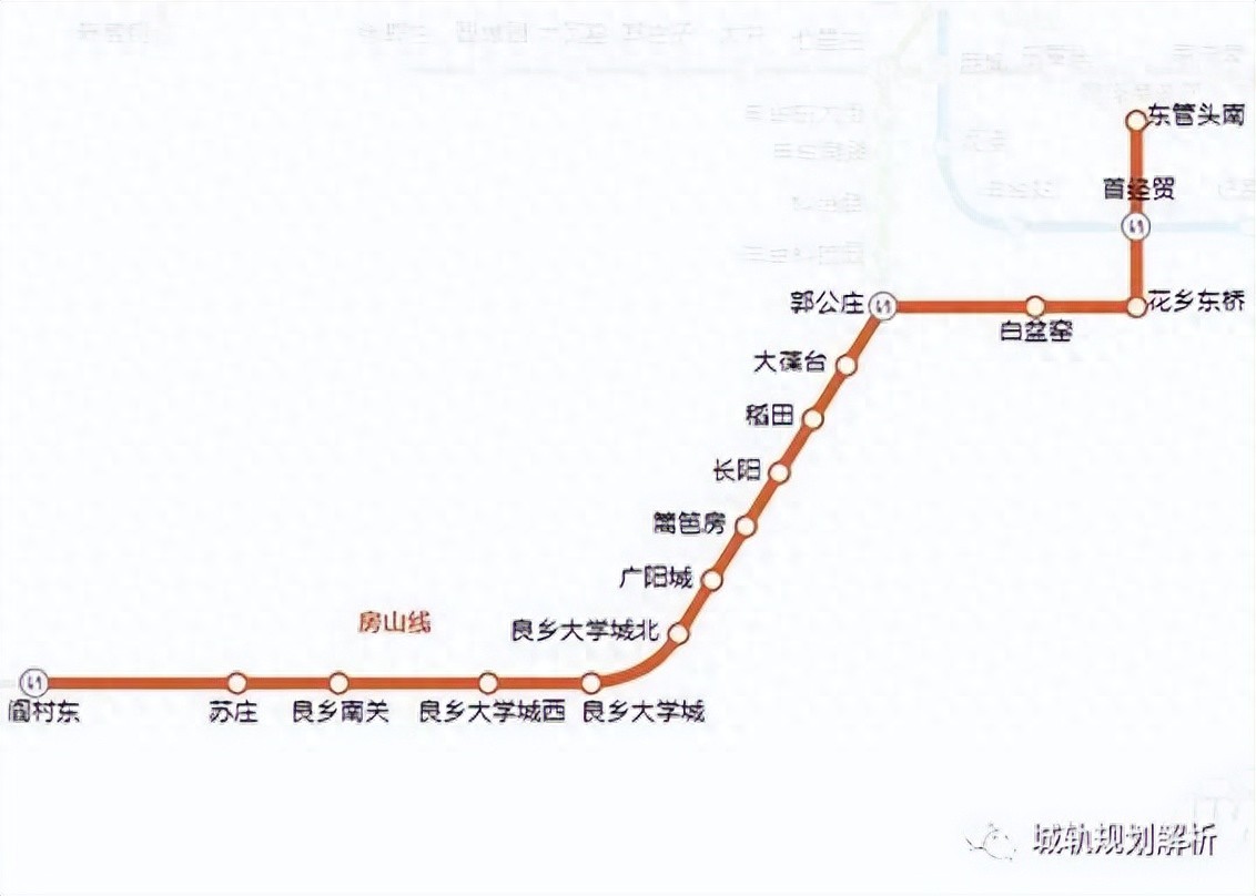 2008年的时候,为了提振经济,北京市加快了地铁基础设施的规划建设,在原S5线规划的基础上确定了房山线的走向,其通车时间由此被提前。房山线一期2010年开通,其从苏庄站始发,最终至郭公庄站接通9号线。2017年底西延段(苏庄站至阎村东站)被开通,2020年底房山线进一步北延至东管头南站,由此连接上了16号线。