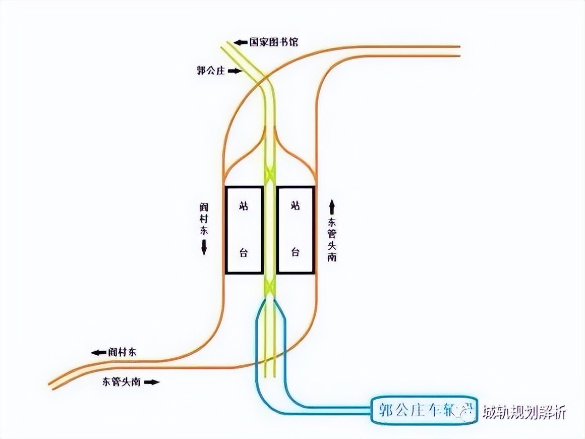 为了解决上述问题,房山线和9号线跨线运行方案被提出。房山线列车白天停放在离市区更近的9号线郭公庄车辆段。晚高峰期间,列车可以从郭公庄站开始继续向北,前往国家图书馆接乘客,再回到郭公庄站并驶入房山线轨道线路,最终回到阎村车辆段。跨线方案不仅可以减少房山线空车的距离行驶,还可以提供两条线路之间的直通服务,这对乘客和运营效率都有好处。