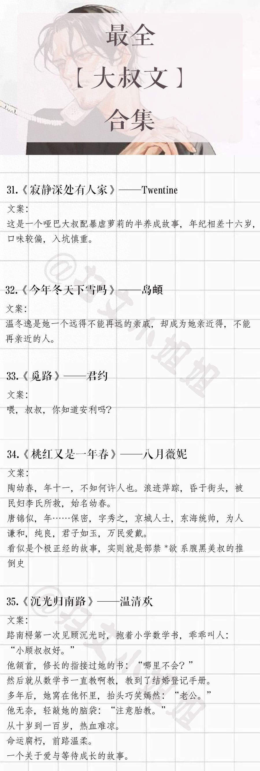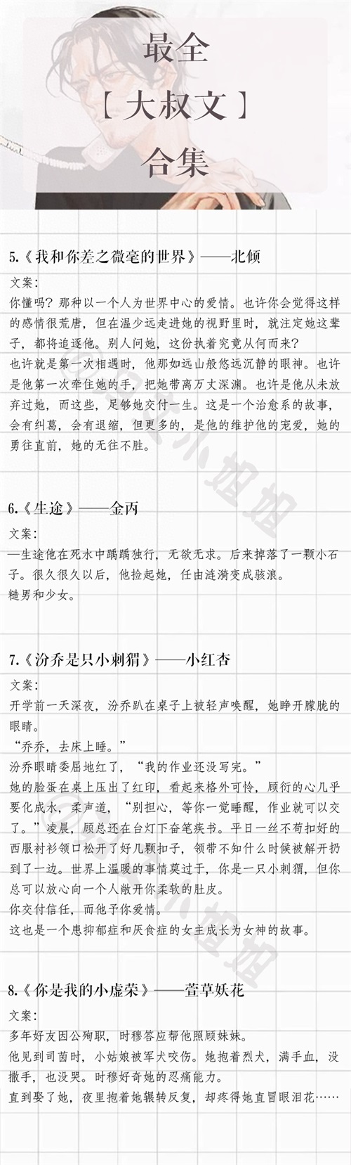 北倾的《我和你差之微毫的世界》这篇文属于大叔系列的经典了,作者大大的温家系列文,女主是被男主家收养的,男主则是她名义上的叔叔,从小陪她长大,文中提到一段女主的爱得不到回应,于是决定出国留学,这段有点小虐,幸好兜兜转转两人还是在一起了,北倾出品,必属精品,放心品读!