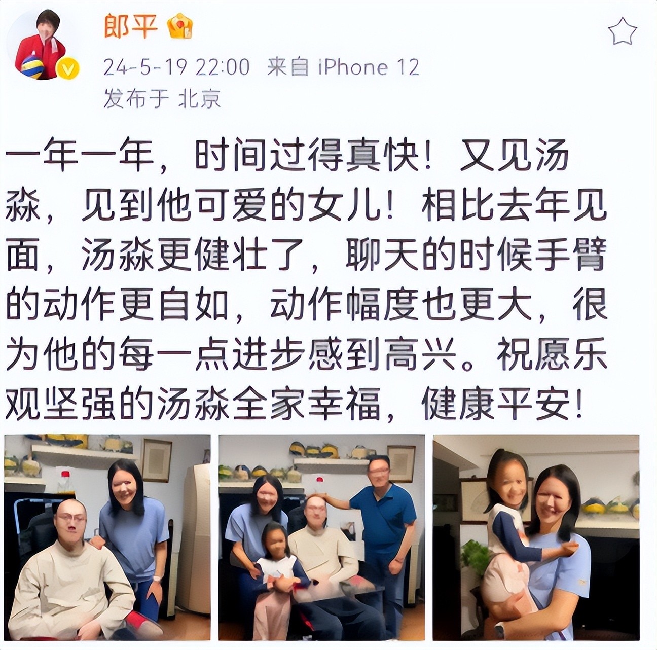 在今年5月19日的时候,郎平还去看望了汤淼,不仅和他的家人留下了合影,还抱了抱汤淼的女儿,照片上的他们,笑的非常开心。