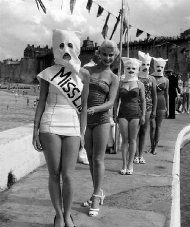14、19世纪30年代,当时美国的选美比赛,都会用头套把参赛者的面部给遮住。主要原因是为了避免晒伤、晒黑,因为晒黑了的肤色,在当时被认为是低下阶层甚至是奴隶的标志。