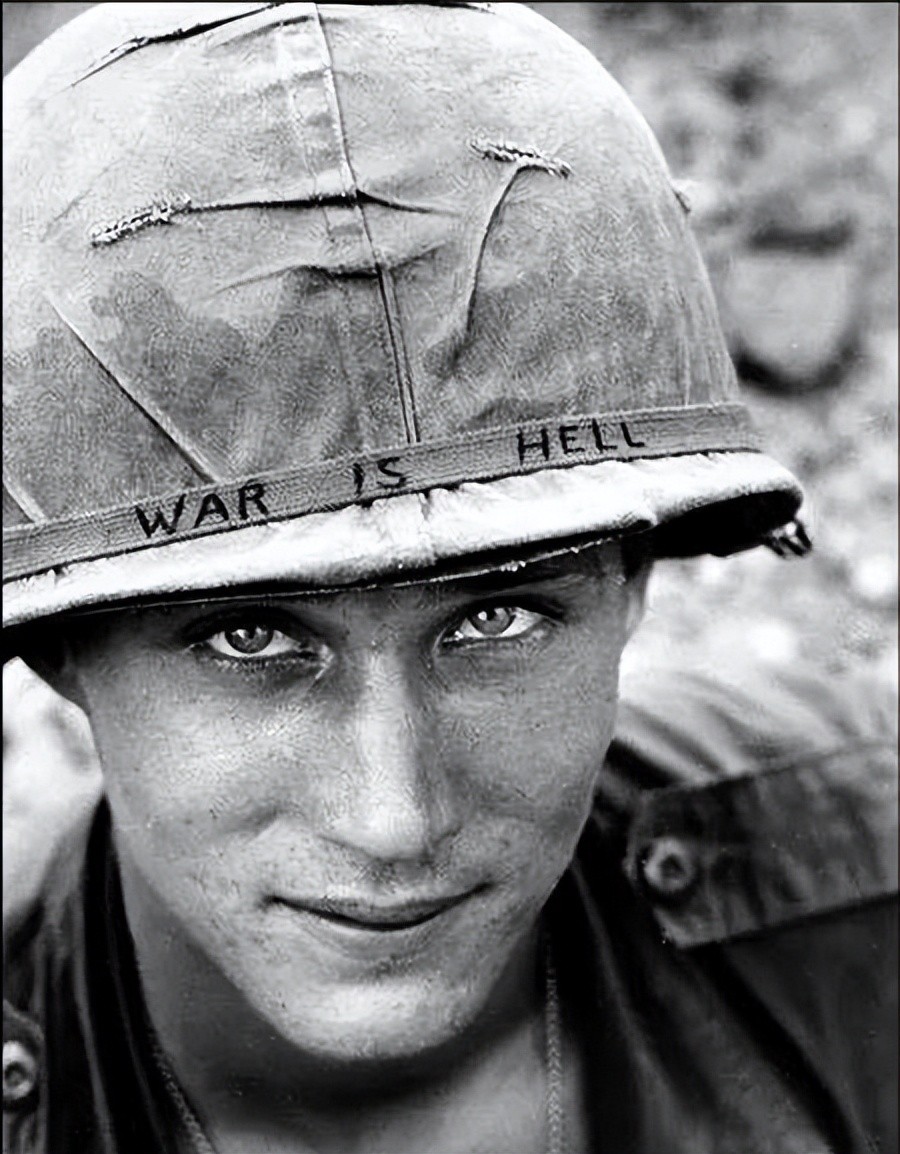 24、1965年,战地摄影师在战壕里拍摄到了这张照片,士兵头盔上写着一句话“战争就是地狱”!随后这张照片在杂志上发表,成为当时极具反战意味的一张照片!