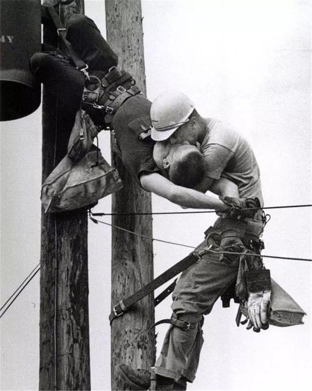 30、1967年,照片上半部分的这名电工被电意外击晕,在失去知觉之后,下半部分的这名同事连忙在电线杆上为其做人工呼吸、心肺复苏。最终在同事的全力抢救下,被电击的人活了下来。