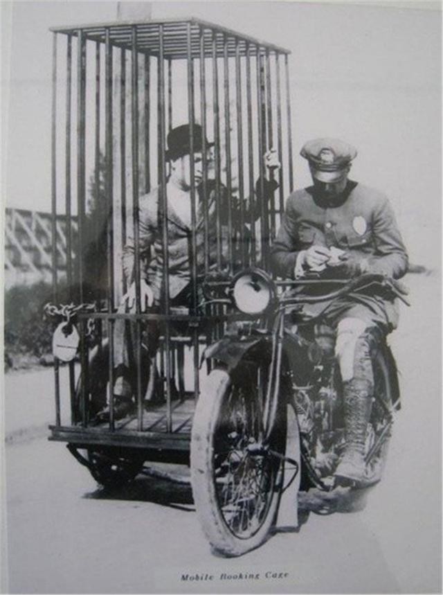28、1921年的老式囚车,就是在一个三轮摩托车旁边加装了一个铁制的大笼子。里面配备了一台凳子,专门在警察局于监狱之间使用。
