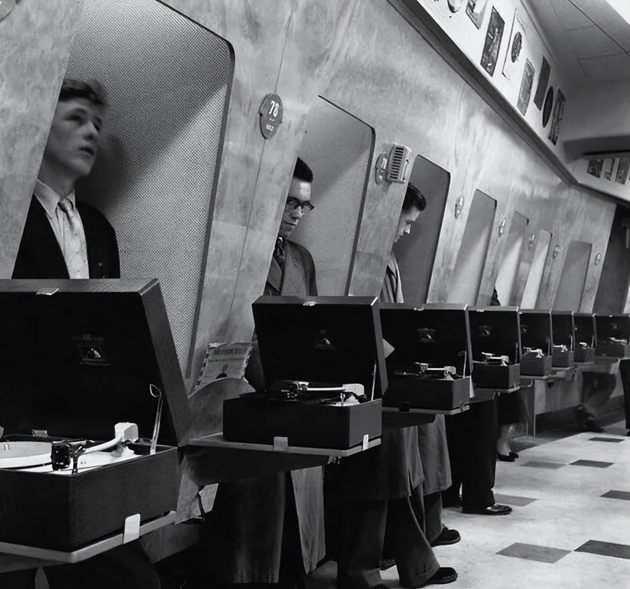 6、上个世纪的唱片店,人们坐在“试听室”里试听选中的唱片。这个机器是“发明大王”爱迪生发明的,可以将声音“刻”在唱片之上,利用专属唱针跟扩音设备放出声音。被誉为爱迪生一生中,最伟大的发明之一!