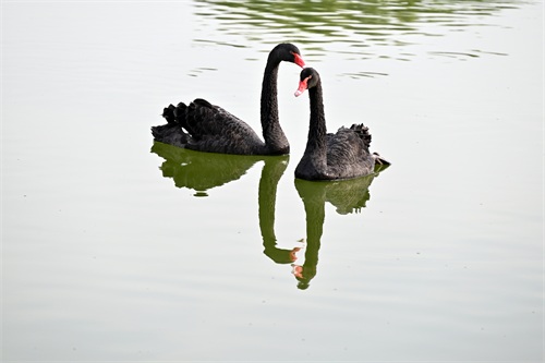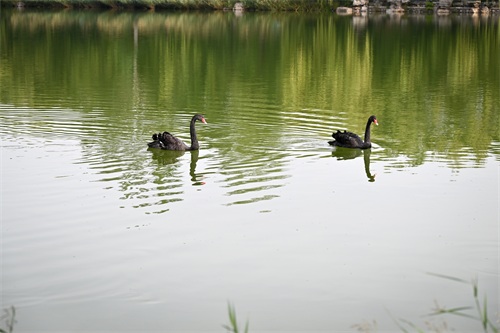两只黑天鹅游到岸边,仿佛在迎接远方的宾朋。