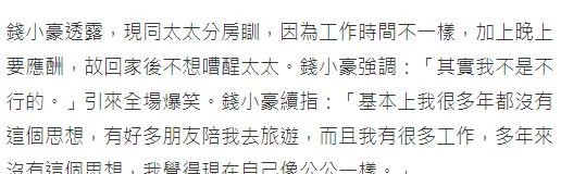 钱小豪的开朗态度在讨论这类敏感话题时特别明显。他还特别强调,这是由于身体状况所限,并非其他原因。他透露,由于与妻子的工作时间不同,他们选择了分房睡,他晚上常有应酬,不想打扰妻子休息。同时,他表示,现在的他更多地享受旅行和工作,自我比喻为公公,意指古代的特殊角色,而非长辈。