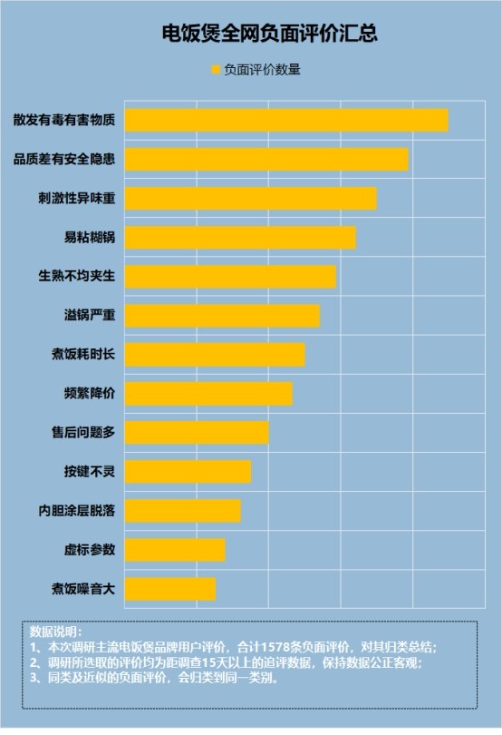 电饭煲有危害么?我们通过上文知道了劣质电饭煲的危害有很多,需要我们时刻提高警惕,那么我们如何规避这些危害呢?为此我向专业的测评机构要到了一张电饭煲全网负面评价汇总表,从图中看到刺激性异味重、易糊粘锅、生熟不均夹生等问题比较频发。接下来,我来给大家详细说说电饭煲行业的四大槽点陷阱,希望大家都能防范,一起来看看吧。