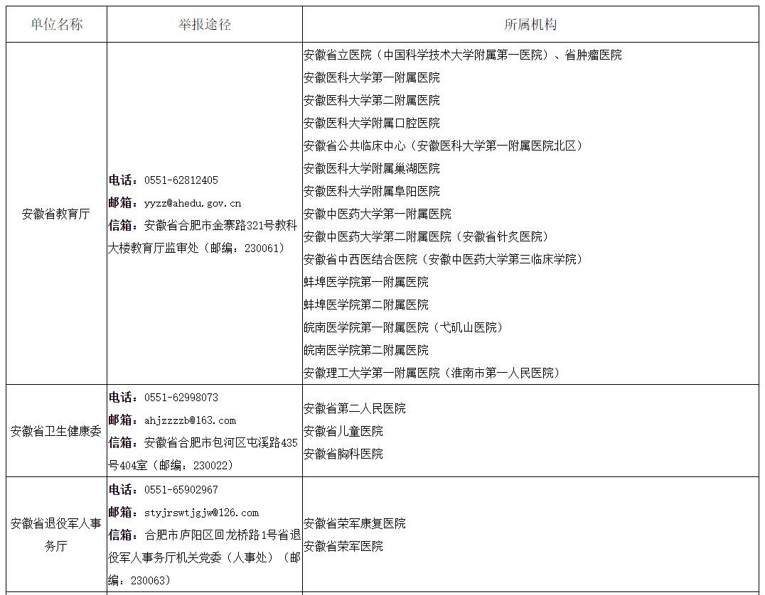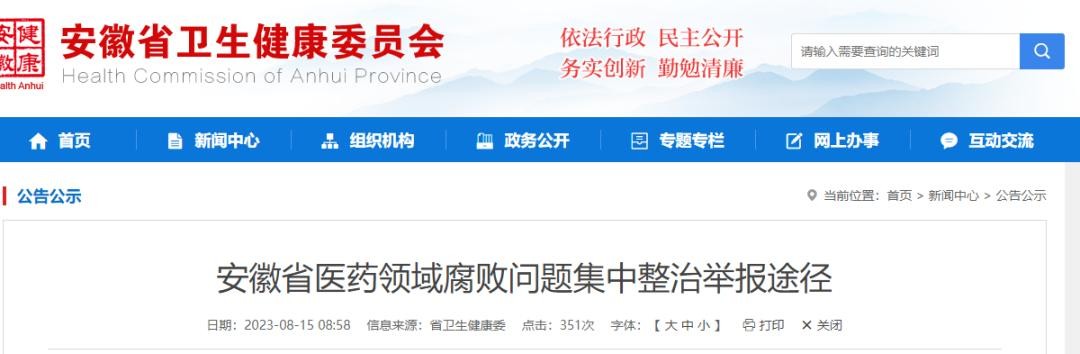8月15日,省卫健委在官网公布安徽省医药领域腐败问题集中整治举报途径,途径包括安徽省教育厅、安徽省卫健委、安徽省公安厅、安徽省人民政府国有资产监督管理委员会、安徽省医疗保障局等。