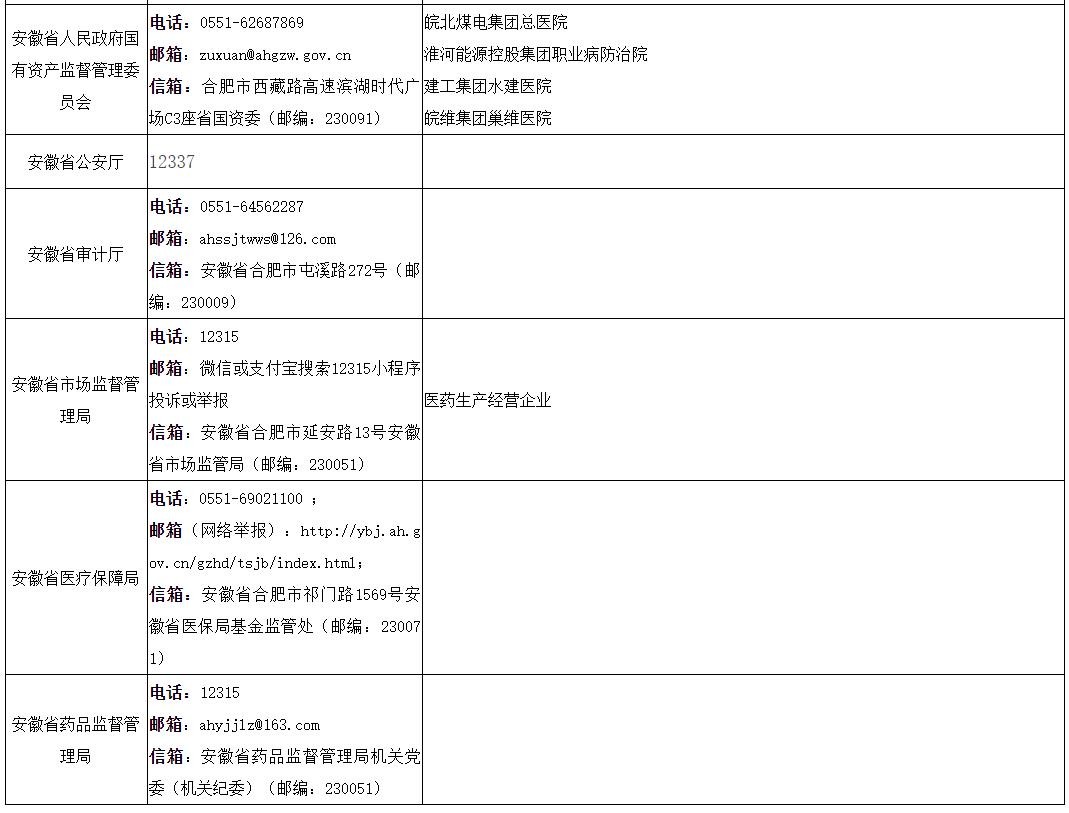 安徽省药品监督管理局举报电话:12315;邮箱:ahyjjlz@163.com;信箱:安徽省药品监督管理局机关党委(机关纪委)(邮编:230051)。