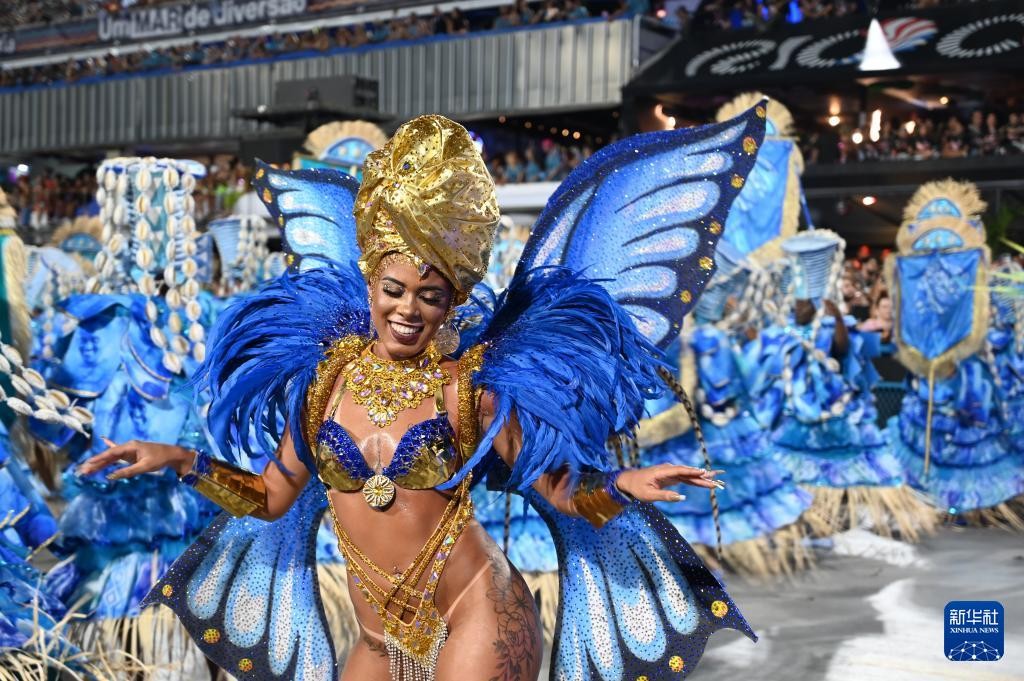 2月13日凌晨,在巴西里约热内卢桑巴大道,桑巴舞校的演员参加狂欢节游行。