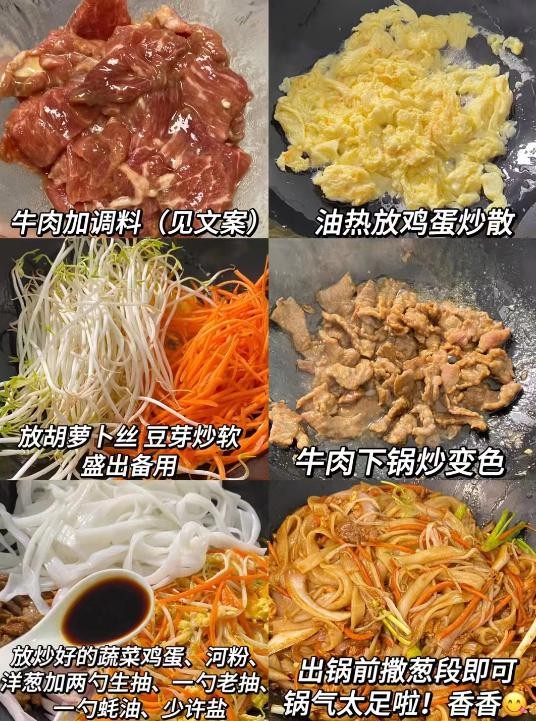 准备食材:牛肉、豆芽、胡萝卜、鸡蛋、河粉